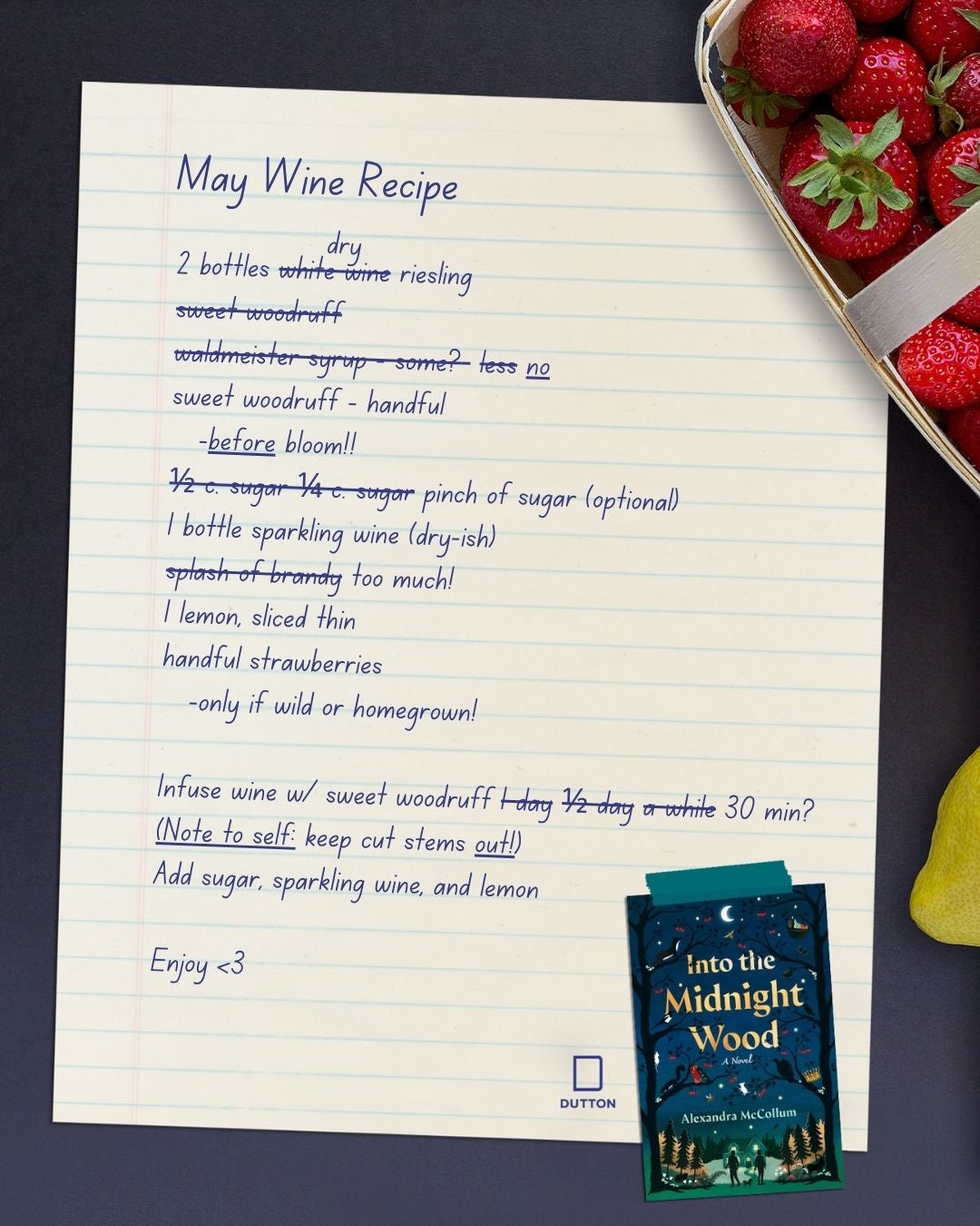 If you find yourself to be kooky like Meredith or fancy yourself to be someone who can decode the kooky like David, take a whirl at making Meredith’s handwritten recipe for May Wine. You’ll need a cup of sugar (or was it a pinch?), 2 bottles of wine (or was it 3?), and the audiobook of Into the Midnight Wood to keep you company while you work your mixology magic.
